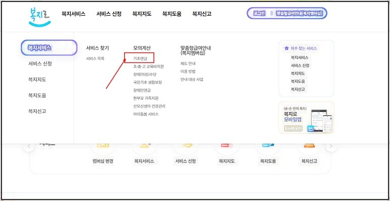 올해부터 처음으로 만약 수급대상이 되었다면 주소지 관할 행복주민센터 및 읍면사무소에 가셔서 신청하실 수도 있고, 국민연금공단의 전화번호 1355로 전화신청을 하실 수도 있고, 아래에 보이는 복지로 홈페이지를 이용해서 인터넷으로도 아래 사진을 참고하여 신청을 할 수 있습니다.