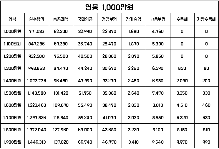 아르바이트를 하는 업종이거나 사회초년생일 때에 해당이 될 것 같습니다. 위의 표를 보시면 아시겠지만 연봉을 1천9백만원 정도로 받기로 되어있다면 실질적으로 한달에 지급받는 것은 144만원 정도라고 할 수 있습니다.