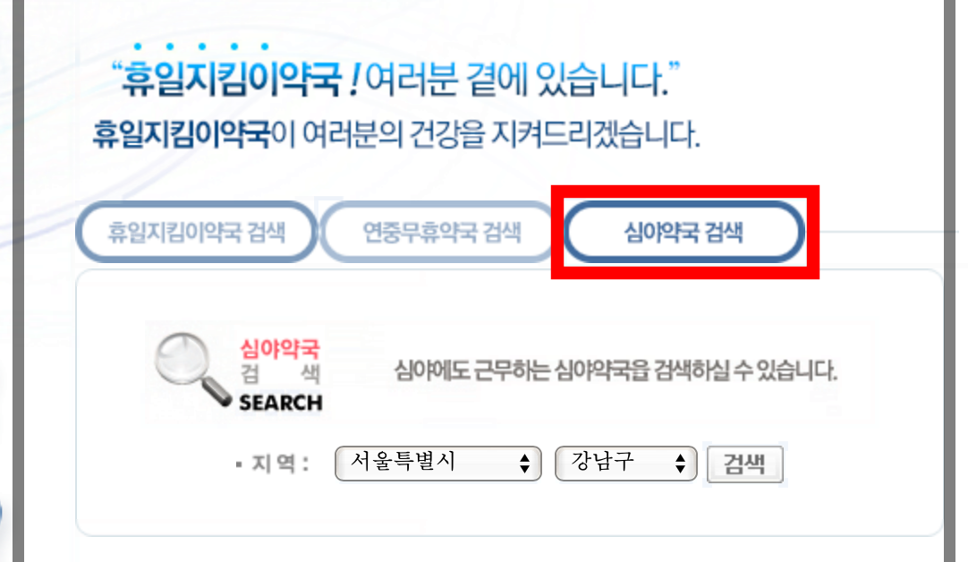'연중무휴 약국 검색'과 '심야약국 검색'으로 일요일에 약국이 문 여는지 알 수 있는데, 이 2가지 검색조회는 살고 있는 시와 구를 적어서 좀 더 많은 범위로써 검색을 할 수가 있습니다.