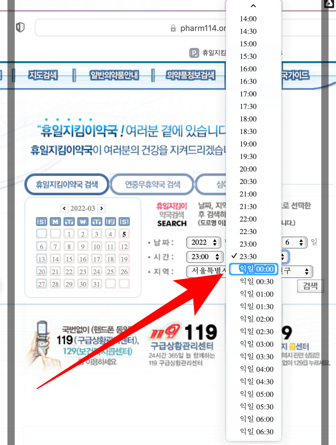 그리고 정확한 시간과 날짜를 지정해서 찾을 수 있는 "휴일 지킴이 약국 검색"이 제일 좋겠다, 싶었는데 시간 선택을 할 때 새벽시간까지 모두 확인할 수 있어서 하단의 우측 사진을 참고해보시면 알게 됩니다.
