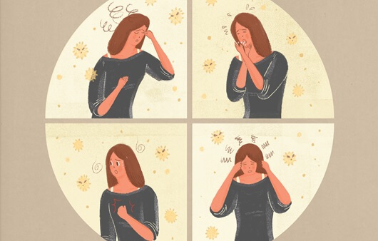 에스트로겐이라는 여성호르몬의 생산량이 갑자기 적어지면서 얼굴이 화끈거리거나 붉어지는 열감을 느낍니다. 전신으로부터 이러한 열감을 느낄 수 있는데요, 가슴, 목, 얼굴에 특히 잘 나타나고, 밤중에 나타나면 수면에 어려움이 있어서 수면장애를 낳기도 합니다. 이러한 불규칙적인 열감으로 인하여 피로가 쌓이고 우울감이나 불안감을 많이 느낄 수 있습니다.